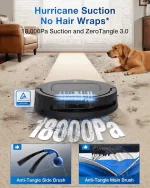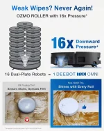 موتور توربینی این مدل توان مکش ۱۸٬۰۰۰ پاسکال را فراهم میکند؛ رقمی که آلودگیهای عمقی فرش، ذرات ریز و گردوغبار را بهطور کامل جمعآوری میکند. ارتفاع بدنه تنها ۹۸ میلیمتر است و به ربات اجازه میدهد زیر مبلمان را بدون گیرکردن تمیز کند. مخزن ۲۲۰ میلیلیتری داخلی نیز پس از پر شدن، توسط ایستگاه OMNI به شکل خودکار تخلیه میشود.