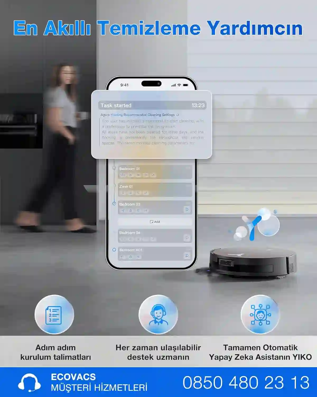 هوش مصنوعی YIKO مسیر حرکت را مطابق چیدمان خانه تنظیم کرده و با قابلیت AI Stain Detection لکه‌های سطحی را تشخیص داده و دو بار تی‌کشی متقاطع انجام می‌دهد.