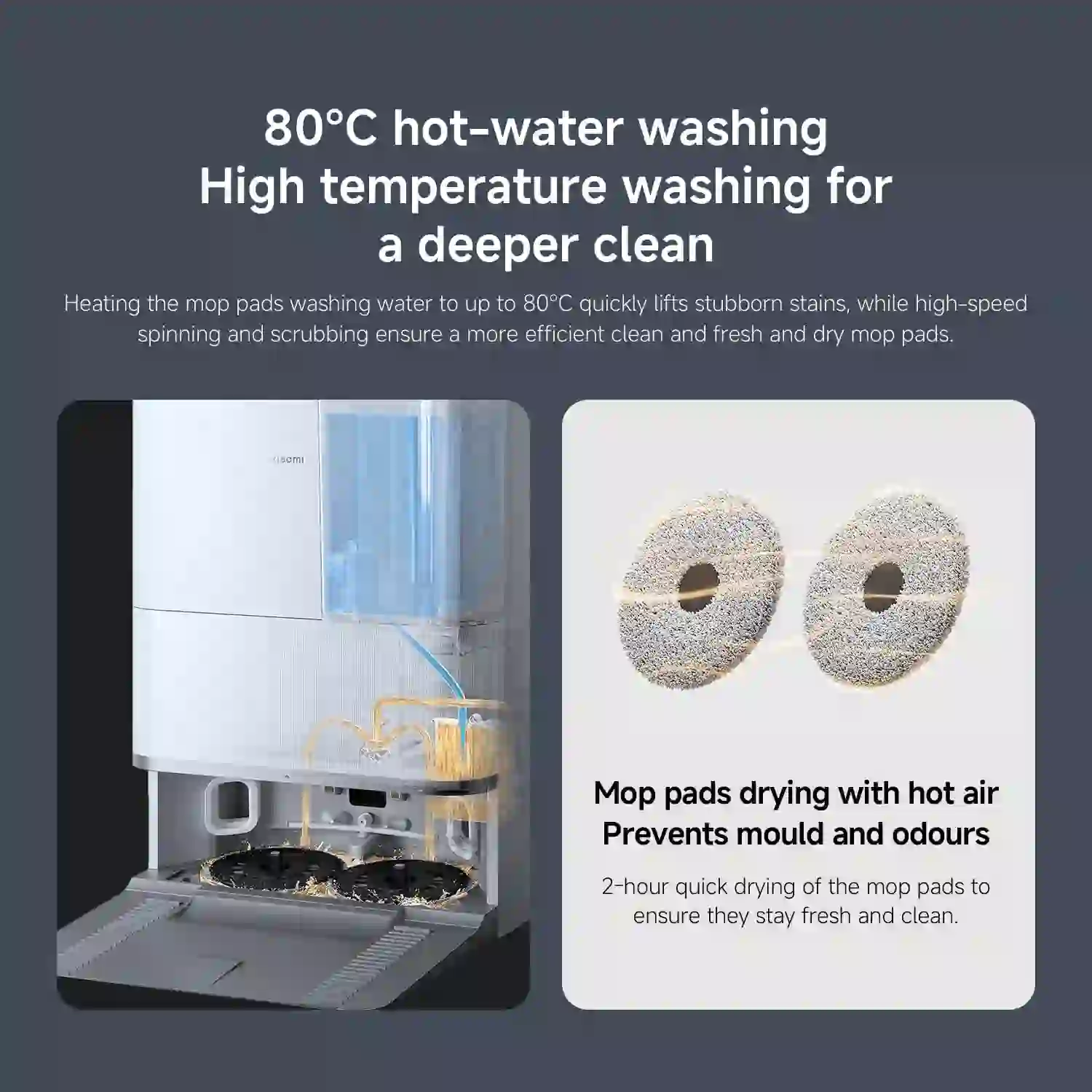 داک Xiaomi Robot Vacuum 5 Pro پس از پایان نظافت، پدهای تی را با آب داغ ۸۰ درجه شستوشو میدهد و سپس با هوای گرم آنها را خشک میکند.