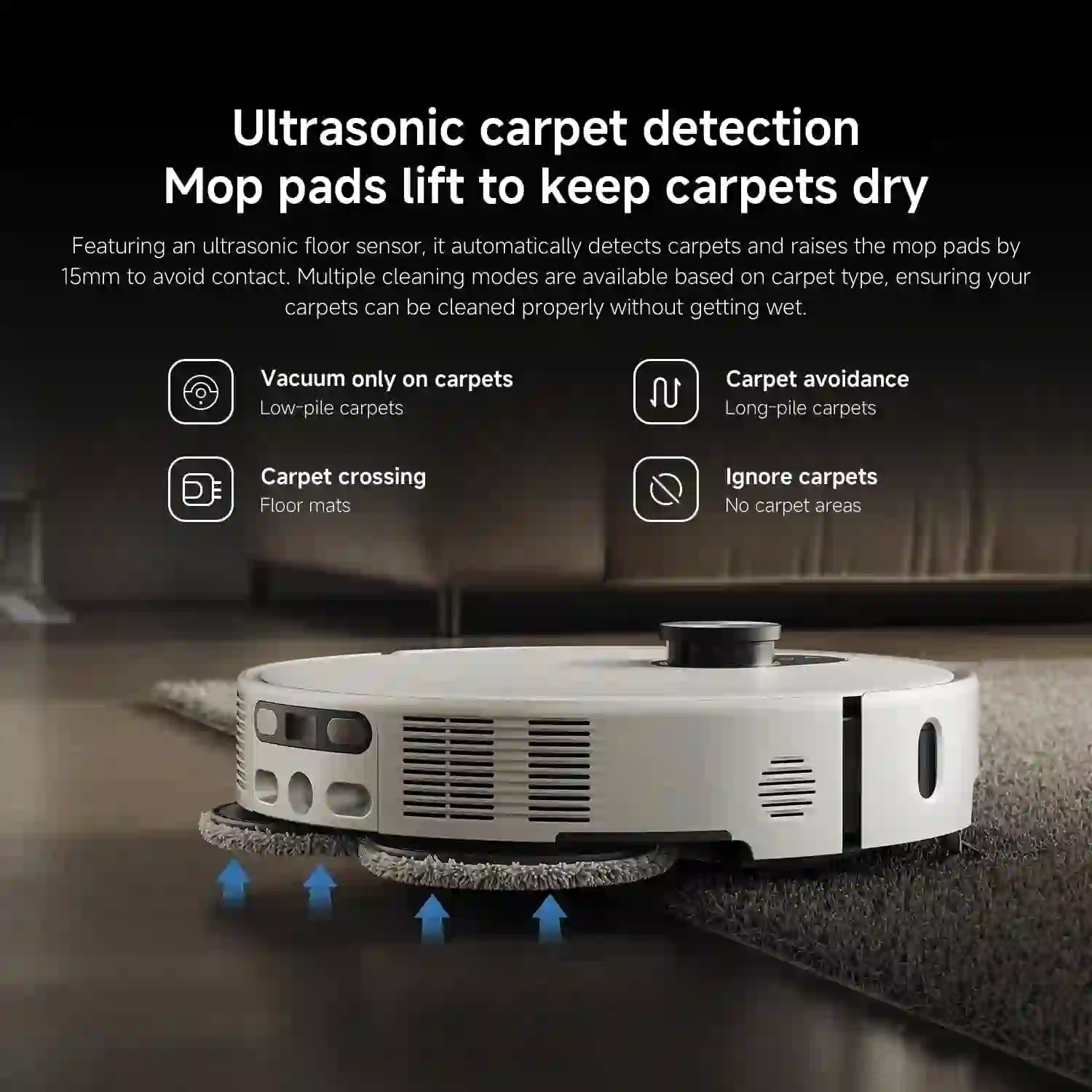 وقتی حسگر اولتراسونیک فرش را شناسایی میکند، پدهای تی تا ۱۵ میلیمتر بالا میروند تا رطوبت به فرش نرسد و تنها مکش فعال بماند.